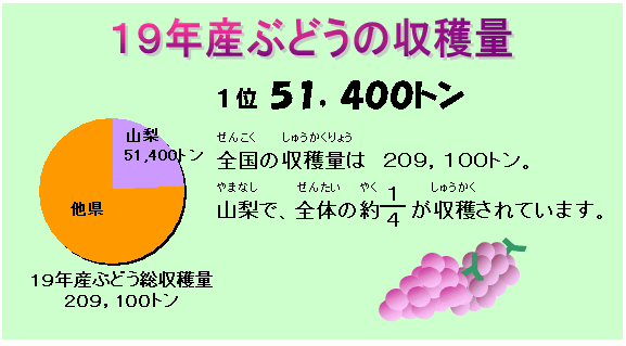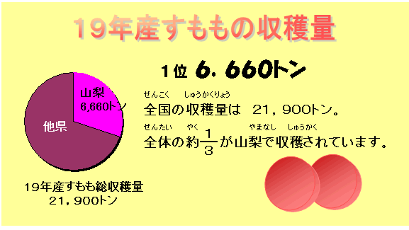 農林水産省(のうりんすいさんしょう)大臣官房(だいじんかんぼう)統計部(とうけいぶ) 「H19年産(さん) 日本なし、ぶどうの収穫量(しゅうかくりょう)及(およ)び出荷量(しゅっかりょう)」 「H19年産(さん)もも、すももの収穫量(しゅうかくりょう)及(およ)び出荷量(しゅっかりょう)」