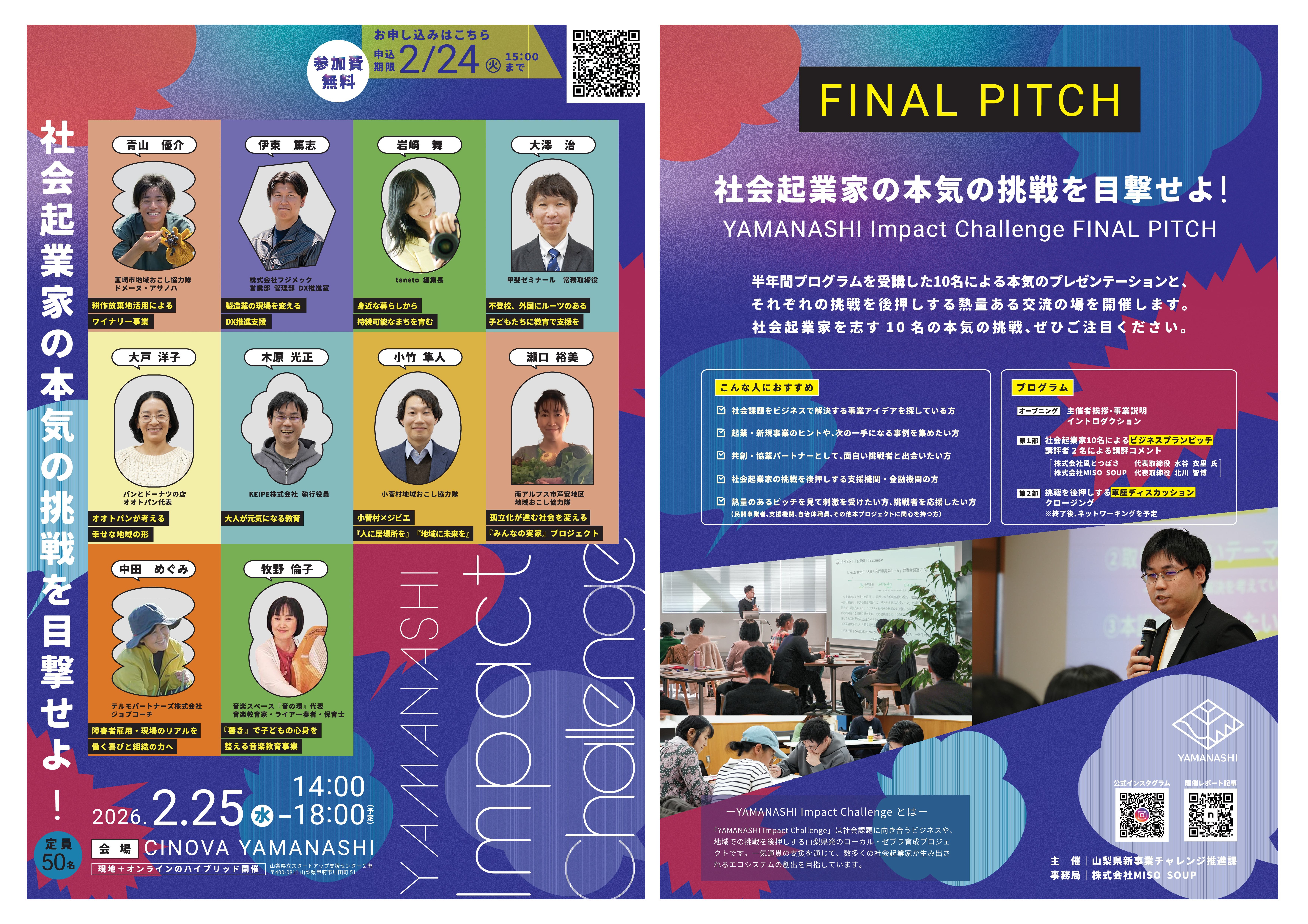トップ > 組織案内 > 新価値・地域創造推進局 > 新事業チャレンジ推進課 > ソーシャルイノベーター(社会起業家)の創出 > やまなしインパクトチャレンジFINAL PITCH