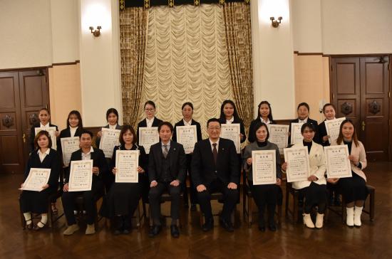 受講者22名が全課程を修了し、副知事から認証書を授与されました。認証を受けた22名の外国人介護人材の皆様の、今後の更なる御活躍を御祈念申し上げます。