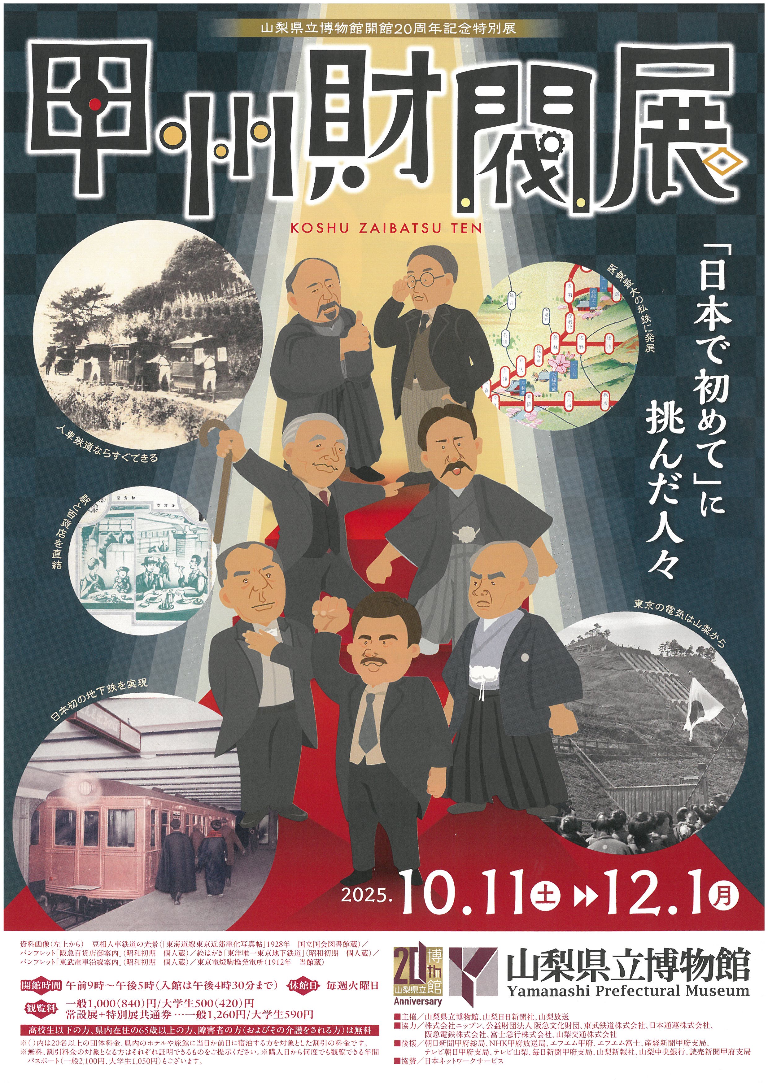 「甲州財閥」とは、明治時代から昭和の戦前期にかけて、鉄道や電力などの分野を中心に活躍した実業家たちの総称です。彼らは、山梨の富と人々のつながりを基盤として、東京などの大都市を舞台にその勢力を拡大していきました。彼らの活躍はその事業の発展にとどまらず、当時の社会や文化、人々の生活にも大きな変化をもたらすものでした。本展では、彼らの「甲州財閥」と称されるほどの成長が、どのように成し遂げられたのかという問いを検証するとともに、「甲州財閥」が現在の私たちに残したものについて明らかにしてまいります。「甲州財閥」の遺産とその足跡から、いま私たちは何を学び得るのでしょうか。