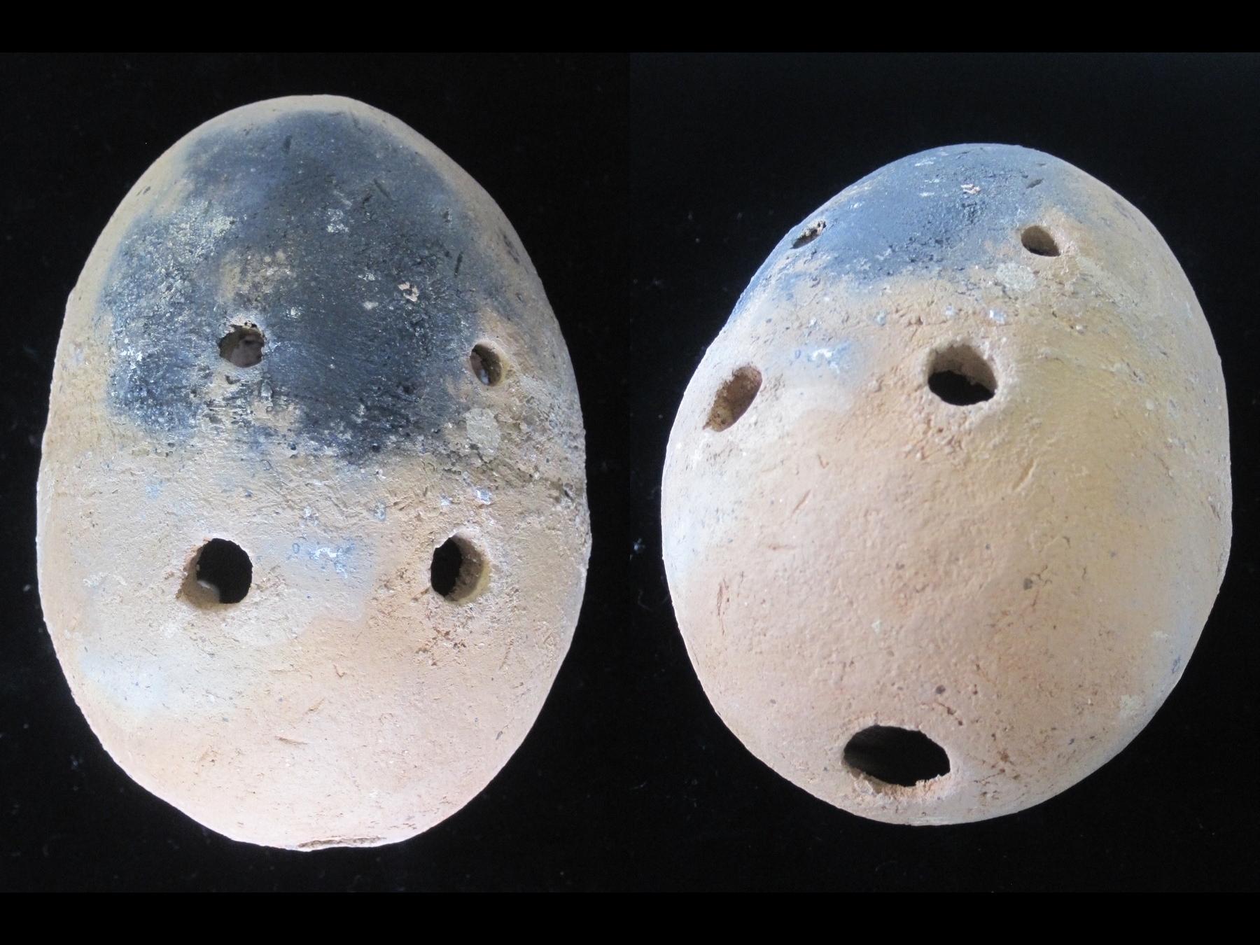 土笛の歴史は古く、日本では縄文時代から作られていました。縄文時代の土笛は息を吹き込む吹き孔(ふきあな)のみをもつ単純な構造で音色も単調なものが主でしたが、やがて指で押さえて音階を調整する指孔(ゆびあな)がつけられるようになります。