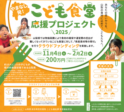 山梨県とふるさと納税ポータルサイト「さとふる」を運営する株式会社さとふるは、寄附金の使途に応じて事業を立ち上げ寄附を募る「さとふるクラウドファンディング」にて、やまなし発!こども食堂応援プロジェクト2025の寄附受け付けを2025年11月4日より開始します。