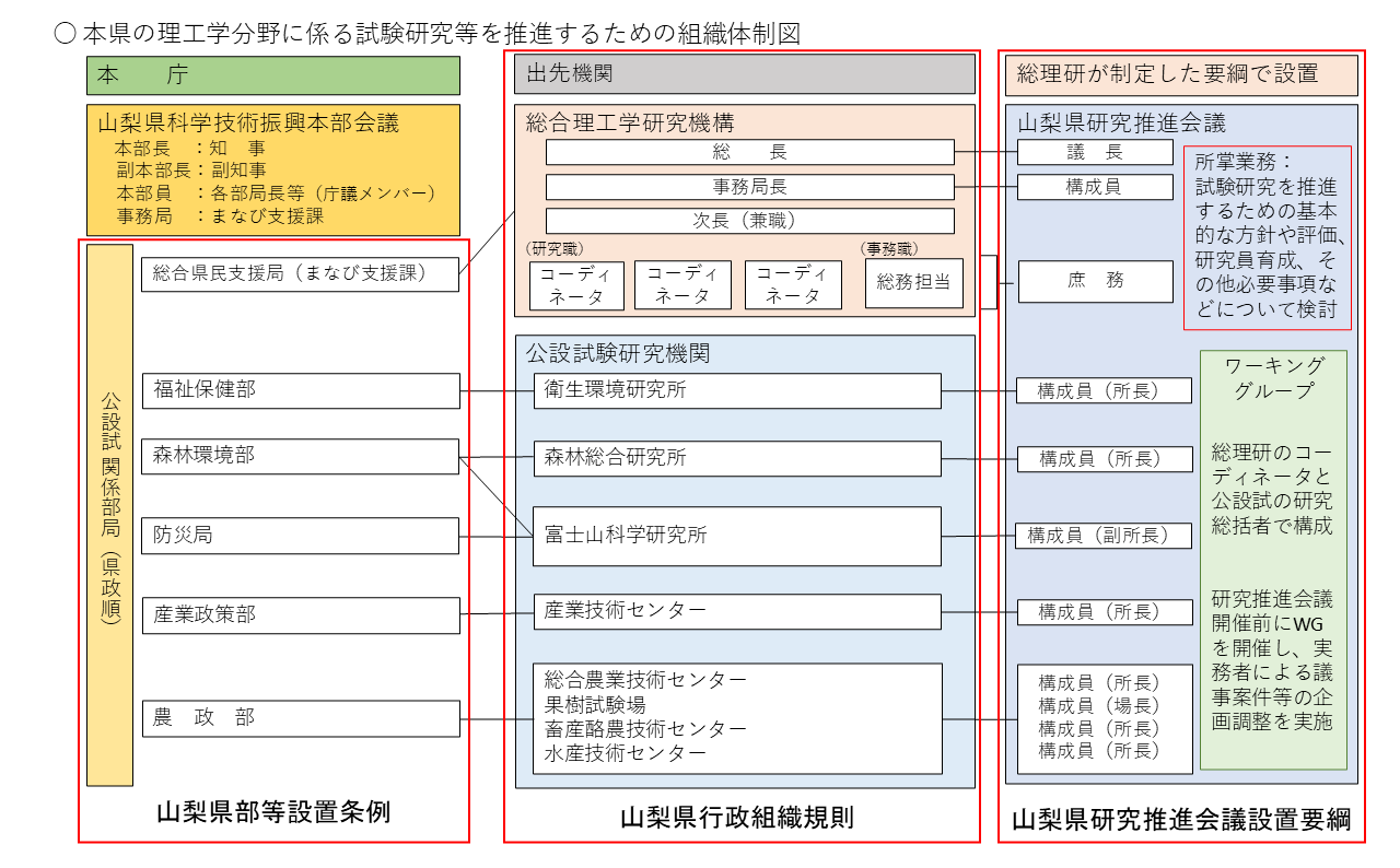 県立試験研究機関が、県の政策課題の効率的かつ効果的な解決を総合的な視点から図り、試験研究の連携や産学官などの取り組みを推進するため、試験研究機関の長等をメンバーとした山梨県研究推進会議を設置しています。