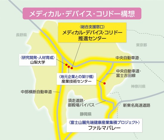 山梨県では、機械電子産業のものづくり技術や立地特性を活かし、甲府盆地から静岡県東部までを回廊のようにつないで、医療機器関連産業の一大集積地に成長させるメディカル・デバイス・コリドー構想の実現を目指しています。