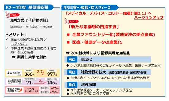 専らメーカーの委託を受け、半導体を製造する台湾のTSMCに代表される、いわゆるファウンドリーの医療機器版を山梨県全体で目指す「全県ファウンドリー化」や医療機器関連産業の市場動向やイノベーションの潮流、本県のポテンシャル等を踏まえ、「医療・健康データの産業化」を目指していきます。具体的には、予防・QOL向上に資する医療機器など、国の医療機器基本計画の重点的推進分野の開発と医療データの活用に向けた「高度化」、ヘルスケア分野の振興を通じた「裾野拡大」、世界市場とその成長性を取り込む「海外展開」の3つの新たな拡大市場への参入に向けた企業支援を通じ、メディカル・デバイス・コリドー構想実現を加速化させます。