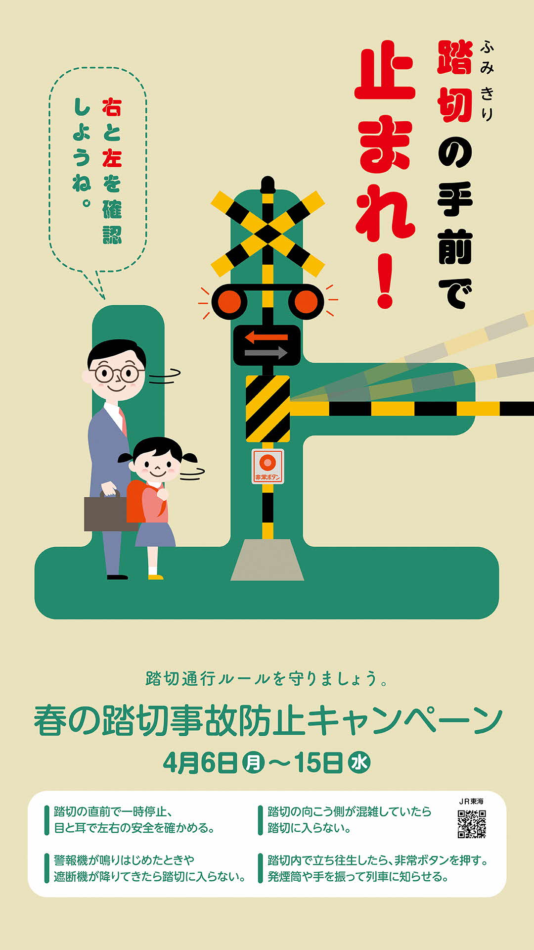 JR東海では、4月6日(月曜日)から4月15日(水曜日)の間、春の全国交通安全運動に合わせて、春の踏切事故防止キャンペーンを実施しております。