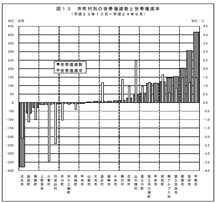 増加した市町村は甲斐市(416世帯)、笛吹市(307世帯)、都留市(202世帯)、富士吉田市(153世帯)等の順であり、増加率では、山中湖村(2.48%増)が最も高く、次いで昭和町(1.65%増)、都留市及び甲斐市(1.47%増)、鳴沢村(1.36%増)等の順となっている。