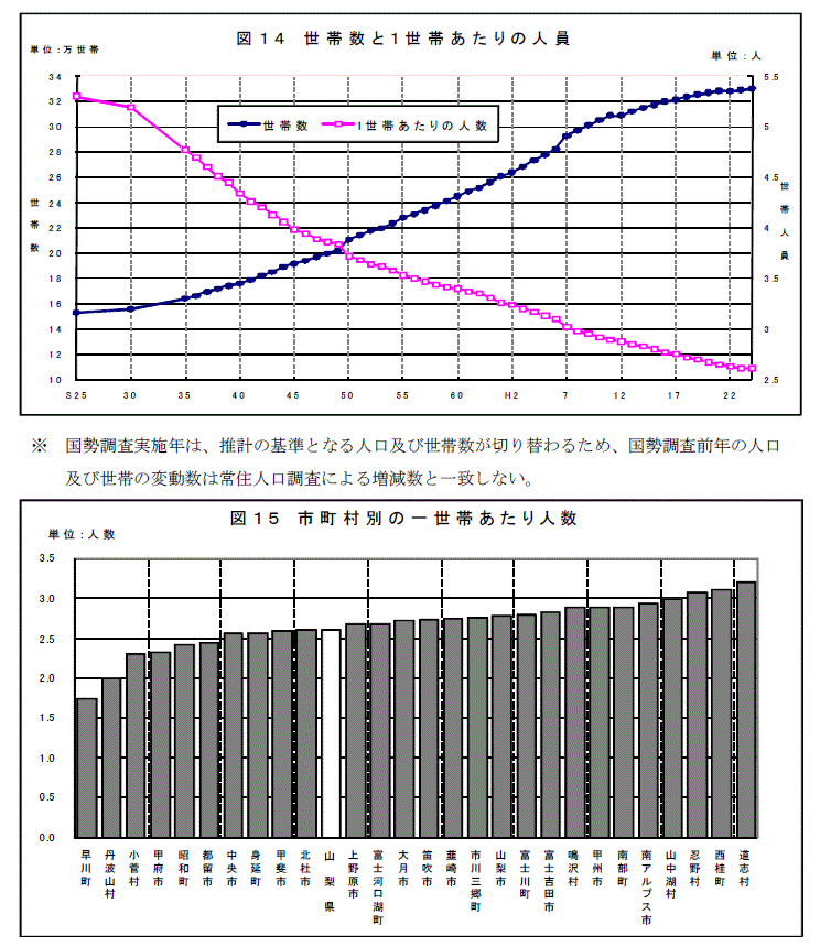 一方、減少した市町村は北杜市(378世帯)、身延町(62世帯)、南部町(30世帯)、上野原市及び小菅村(12世帯)等の順であり、減少率では小菅村(3.44%減)が最も高く、次いで丹波山村(2.41%減)、北杜市(2.09%減)、身延町(1.13%減)の順となっている。