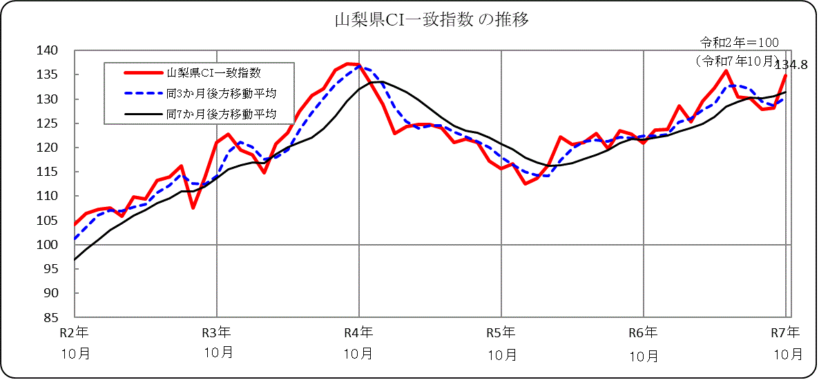 ○CI先行指数は 154.1となり、前月と比較して 11.5ポイントの上昇 →寄与度では、新設住宅着工戸数が3.84 と最も大きく上昇に寄与 ○CI一致指数は 134.8となり、前月と比較して 6.6ポイントの上昇 →寄与度では、鉱工業生産指数(鉱工業)が2.97 と最も大きく上昇に寄与 ○CI遅行指数は 157.1となり、前月と比較して 4.8ポイントの下降 →寄与度では、常用雇用指数(製造業30人以上)が△4.25と最も大きく下降に寄与